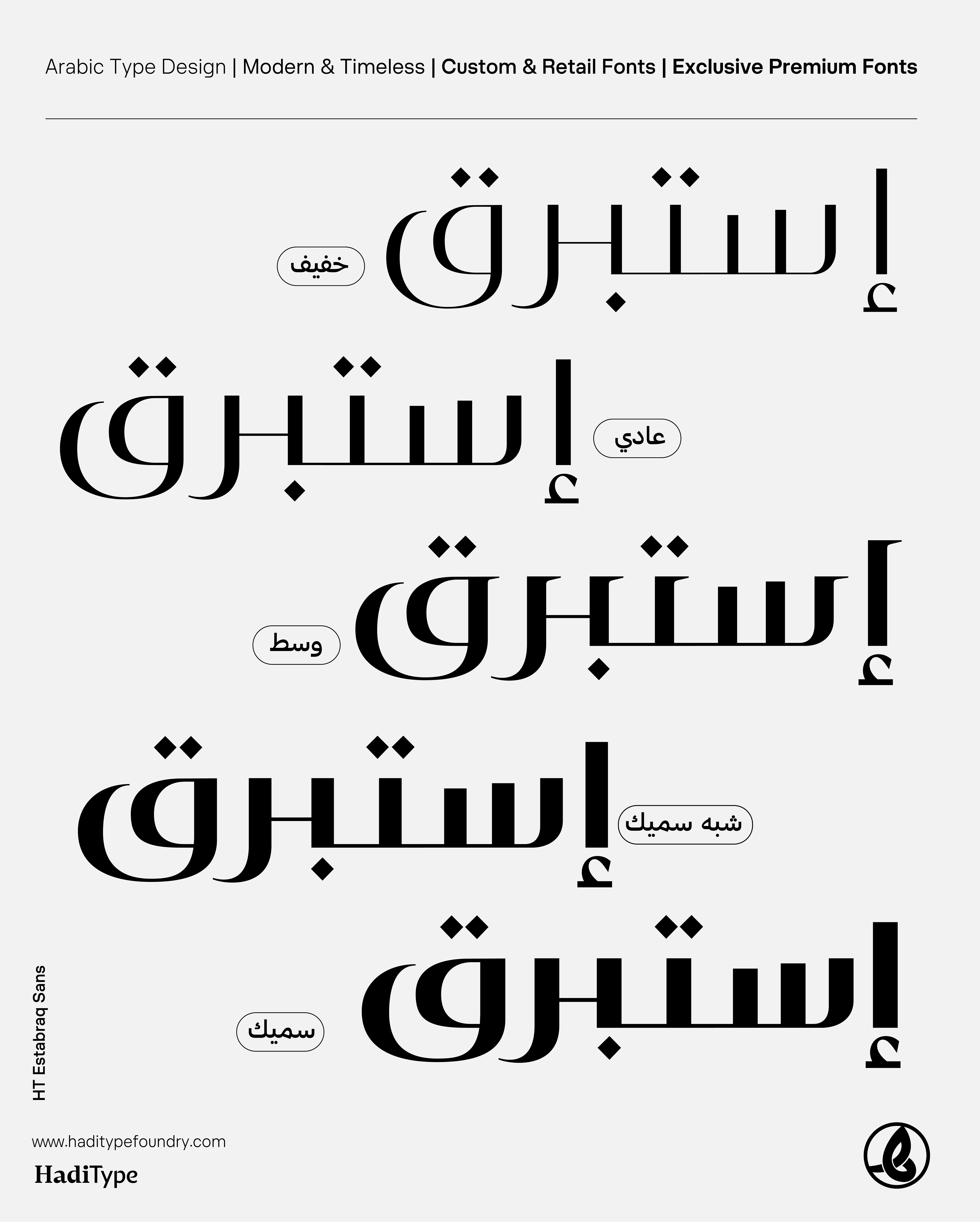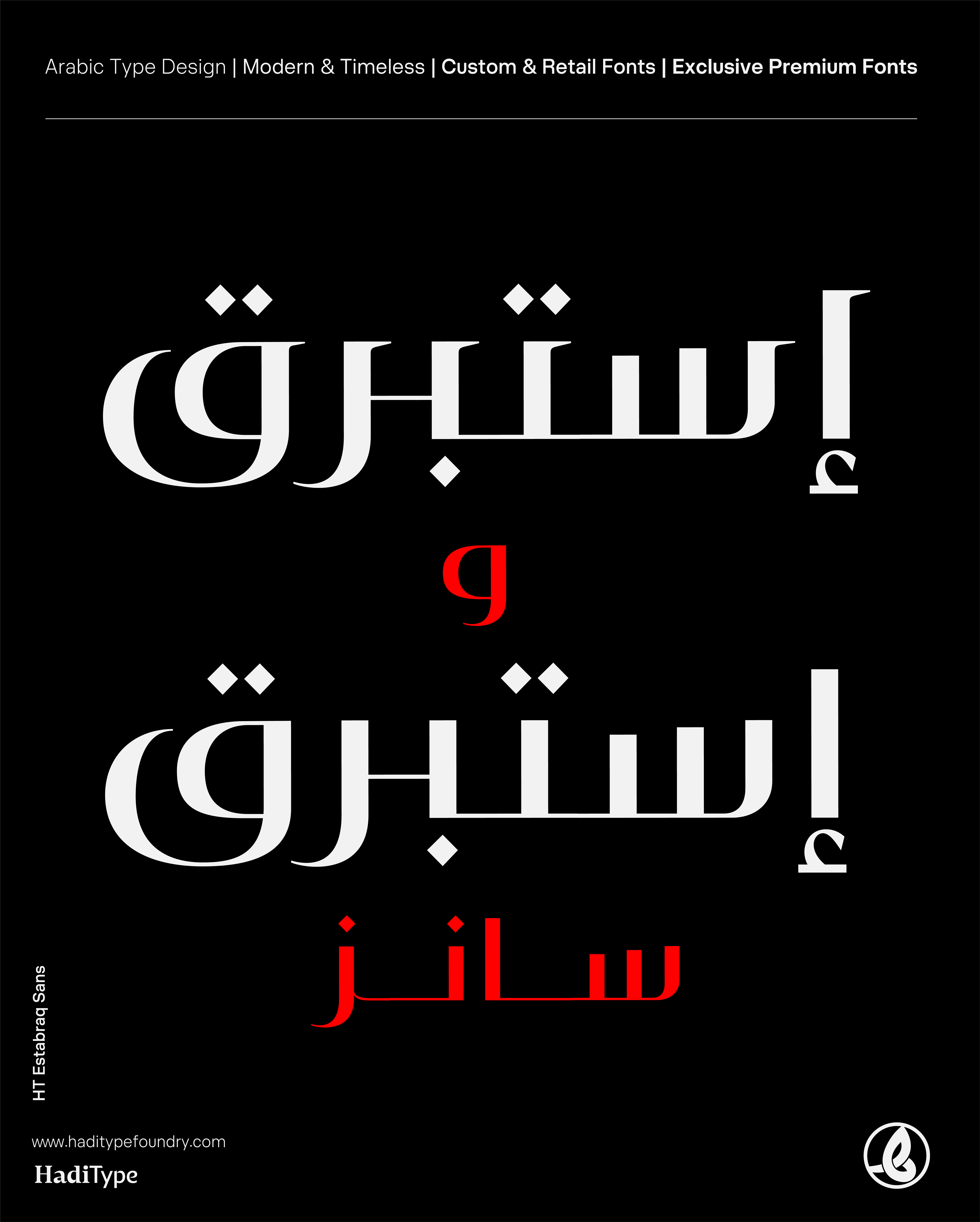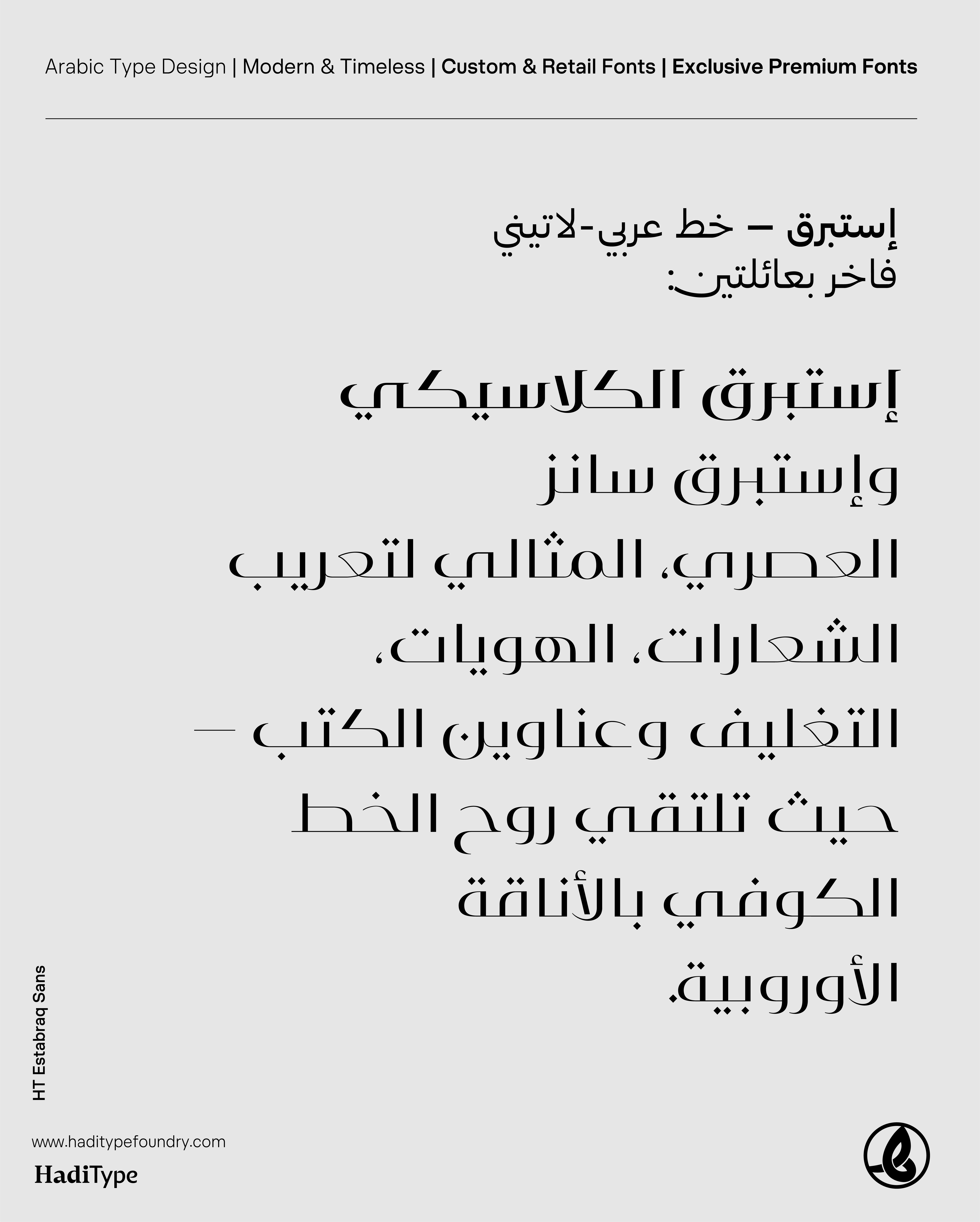 Together, these two families offer designers the flexibility to navigate between timeless elegance and modern simplicity, making Istabraq the ideal choice for logo Arabicization, premium branding, packaging, and cultural publications.